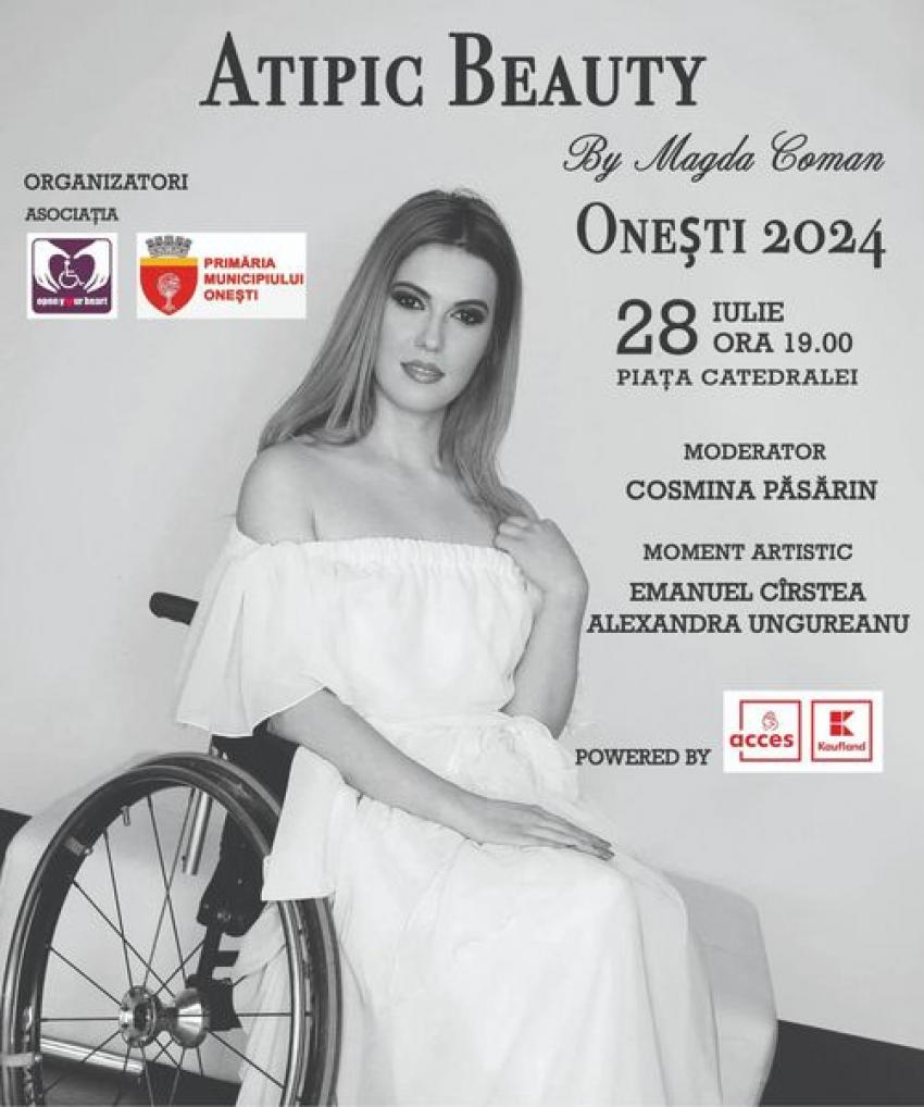 Duminică, 28 iulie, de la ora 19:00, pe scena Atipic Beauty Onești vor urca 12 modele de viață extraordinare în fotoliu rulant, care vor defila alături de personalități locale din Onești și nu numai. Scopul evenimentului consta în speranța de a schimba ideile preconcepute și de a arăta societății că verticalitatea, puterea și calitatea unui om nu depind de modul său de a se deplasa.