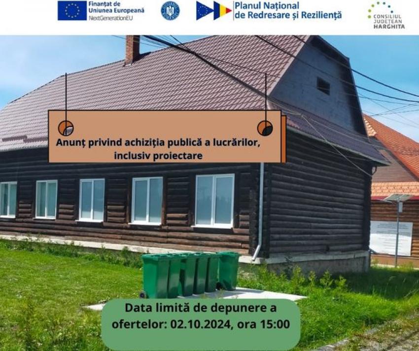 În vederea încheierii unui contract de achiziție publică a lucrărilor pentru obiectivul de investiții : „Renovarea energetică a Centrului Școlar pentru Educație Incluzivă Bilbor Pavilionul 10 (PT+DTAC+execuție)”, Consiliul Județean Harghita a publicat în SEAP anunțul de participare simplificat