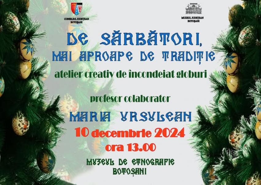 Muzeul Judetean Botosani, Secția de Artă Plastică – Etnografie – Științele Naturii desfăşoară, în data de 10 decembrie 2024, începând cu orele 13.00, atelierele creative intitulate „De sărbători, mai aproape de tradiţie”, la sediul Muzeului de Etnografie din Bulevardul Mihai Eminescu, nr. 50.