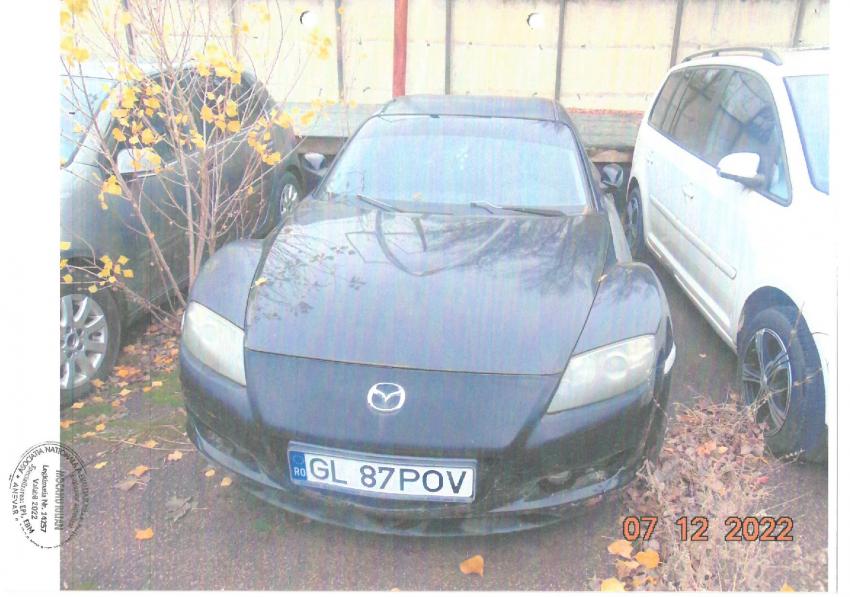- Mazda RX8 SE 17N, berlină, Euro 4, fabricată în 2007, pe benzină. Are 2.616 cmc, 192 CP, lipsă documente și chei, 92.022 km înregistrați în bord la instituirea sechestrului. Prețul de pornire este de 20.870 lei, fără TVA.