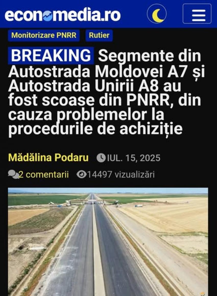 E jalnic că cei care au prioritizat - în PNRR-ul secretizat de Ghinea, să ne amintim (!) - milioane pe consultanță şi trotinete electrice, vor să îngroape autostrada A7, în tot felul de corecții financiare ca să dăm banii înapoi, tocmai acum când constructorul băcăuan UMB e pe cale să finalizeze lucrarea!