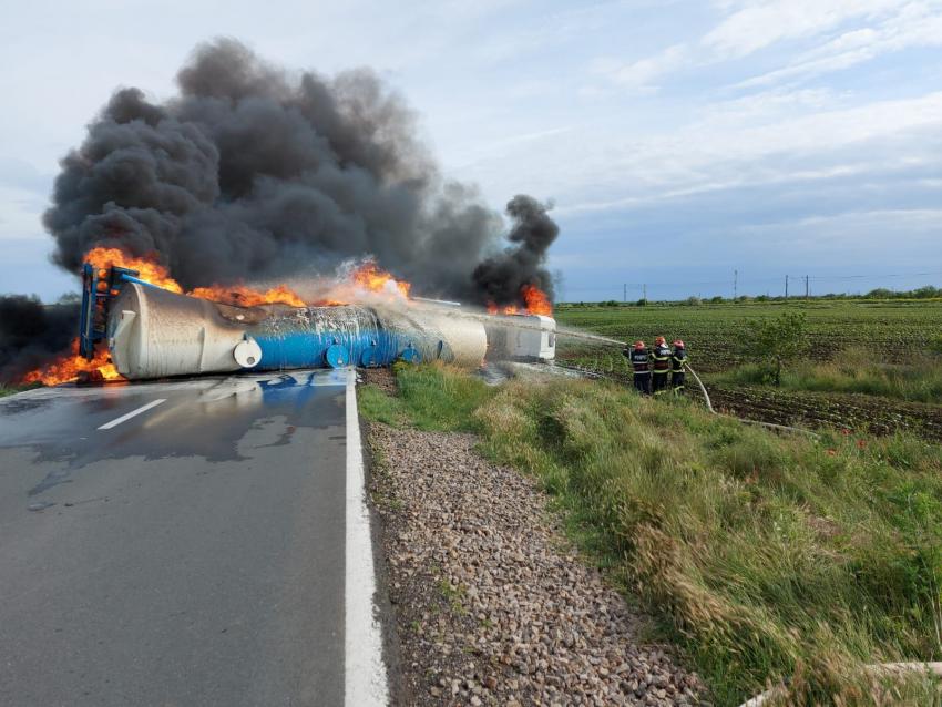 O autocisternă a luat foc și s-a răsturnat pe o șosea din județul Brăila. Recomandat