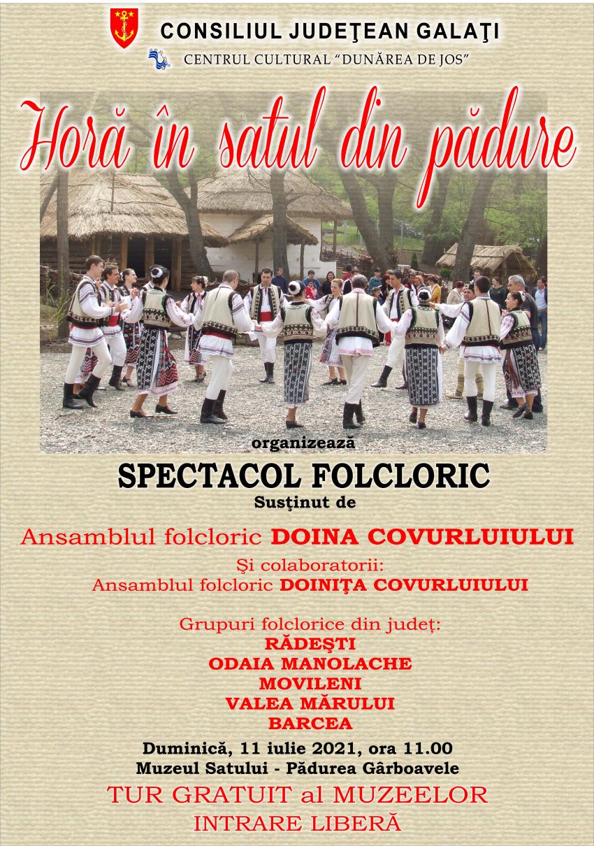 Consiliul Județean Galați și Centrul Cultural Dunărea de Jos organizează duminică, 11 iulie 2021 începând cu ora 11.00 spectacolul folcloric ”Horă în satul din pădure” cu participarea Ansamblului Folcloric Doina Covurluiului.