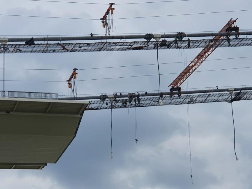 „Au sosit în șantier 32 de tronsoane de tablier. 10 au fost montate deja, pe zona centrală a podului. Alte câte 5 elemente de tablier au fost sudate la sol, la fiecare pilon (de pe malul dinspre Brăila și de pe malul dinspre Tulcea). 6 tronsoane au fost montate între blocurile de ancoraj și piloni, pe ambele maluri. Alte 6 tronsoane, 3 pe fiecare mal, se sudează și se pregătesc de montaj, lângă blocurile de ancoraj”, a anunțat Irinel Scrioșteanu, pe pagina sa de Facebook.