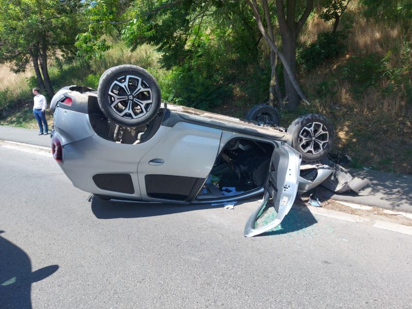 Accident pe Faleza Superioară a Dunării din Galaţi, după ce două maşini care se deplasau pe banda a două de circulaţie, s-au ciocnit. Una dintre ele s-a răsturnat.