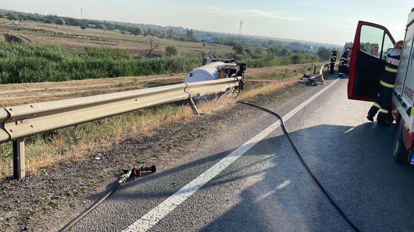 Accident rutier, în această dimineață, pe E 87, la ieșirea din țară, în punctul de trecere a frontierei Galați Rutier. Un tir cu cisternă încărcată cu GPL a rupt parapetul de protecție al drumului și s-a răsturnat în afara părții carosabile.