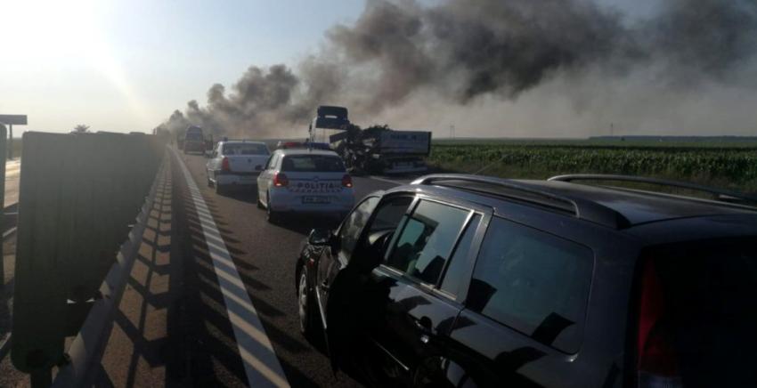 Panică pe Autostrada Soarelui, București-Constanța. Două tir-uri s-au ciocnit, iar unul dintre ele a luat foc. Accidentul nu s-a soldat cu persoane rănite, însă traficul a fost blocat.